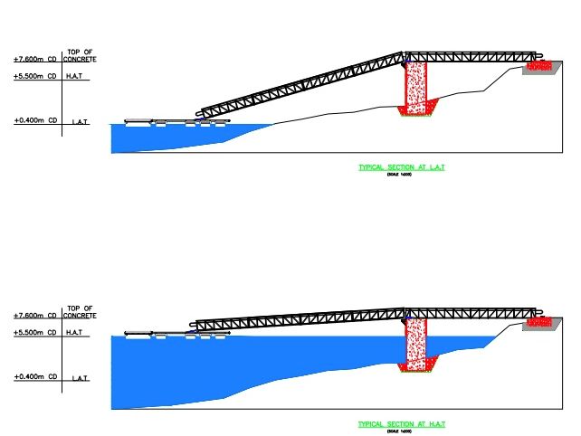 Dimensions: The fixed land to pier gangway is 15m long and the articulating gangway from pier to pontoon is 24m long. Both gangways are 1.2m wide.